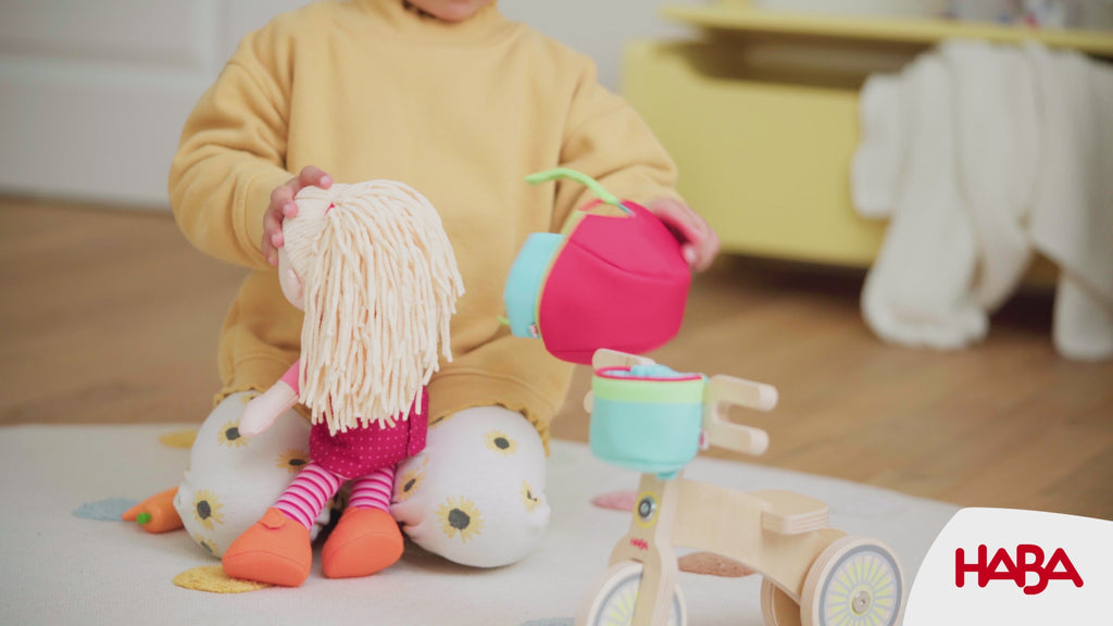 Net als haar grote voorbeelden wil ook pop Annelie de wereld ontdekken met haar loopfiets. Uiteraard draagt ze een fietshelm en heeft ze een fietsmand voor snacks of als ze onderweg iets leuks vindt. Stevige houten loopfiets met dubbel achterwiel voor stabiliteit. Inclusief hoogwaardig afgewerkte stoffen pop en accessoires.